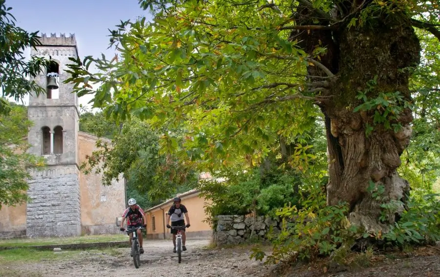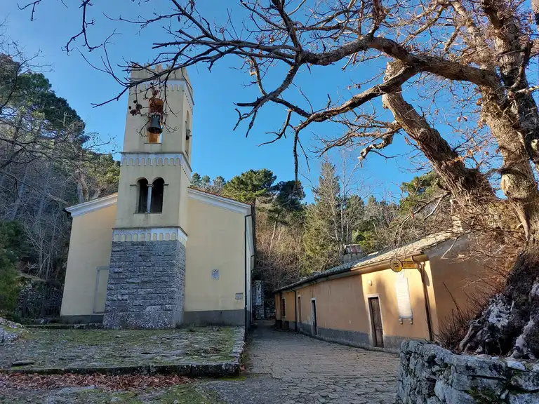 Der Weg Nr. 103 beginnt direkt an der Festung. Etwa 50 Meter die Hauptstraße hinab finden Sie auf der linken Seite einen gut ausgeschilderten Anstieg. Dieses antike Steinpflaster, umgeben von majestätischen Kastanienbäumen, führt in wenigen Minuten zu einer kleinen Raststelle, wo sich die erste der 14 Kapellen des Kreuzwegs befindet. Entlang dieses historischen und spirituellen Pfades erreichen Sie das Heiligtum in einer Atmosphäre von Frieden und natürlicher Schönheit.